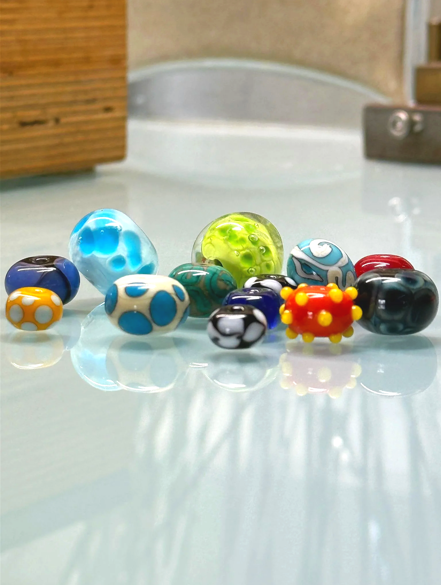 In this class, we will cover advanced lampworking techniques. It includes learning about encased floral beads, sculpting, and silver glass reactions. Your beads will be fully annealed, cleaned, and either ready for pickup or posted to you — yours to use however you like.